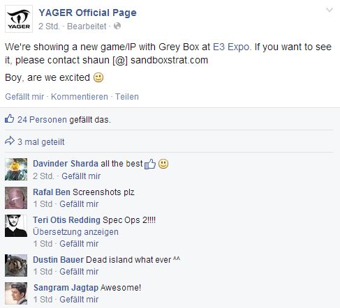 Dabei handelt es sich laut YAGER-Facebook-Seite um eine neue IP (Intellectual Property), also um eine völlig neue Marke. An einem Nachfolger zu Spec Ops: The Line soll YAGER für 2K Games angeblich auch arbeiten, doch diesen werden wir nächste Woche vermutlich noch nicht sehen.